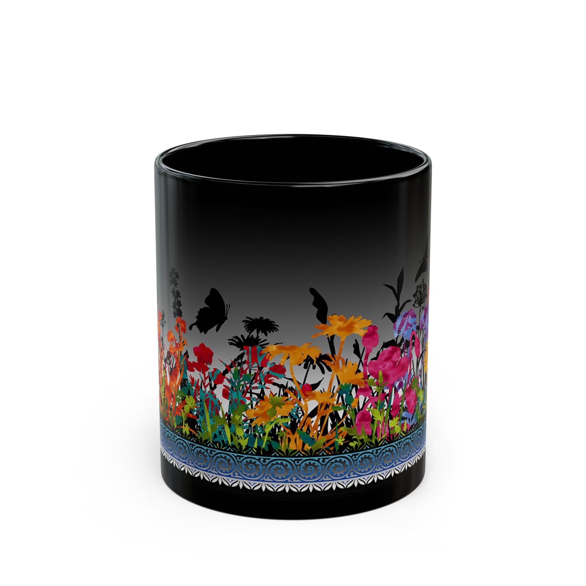 Ceramic Mug: Black; "Dreamscapes II" [Flower Garden] - From In the Beginning Fabrics.