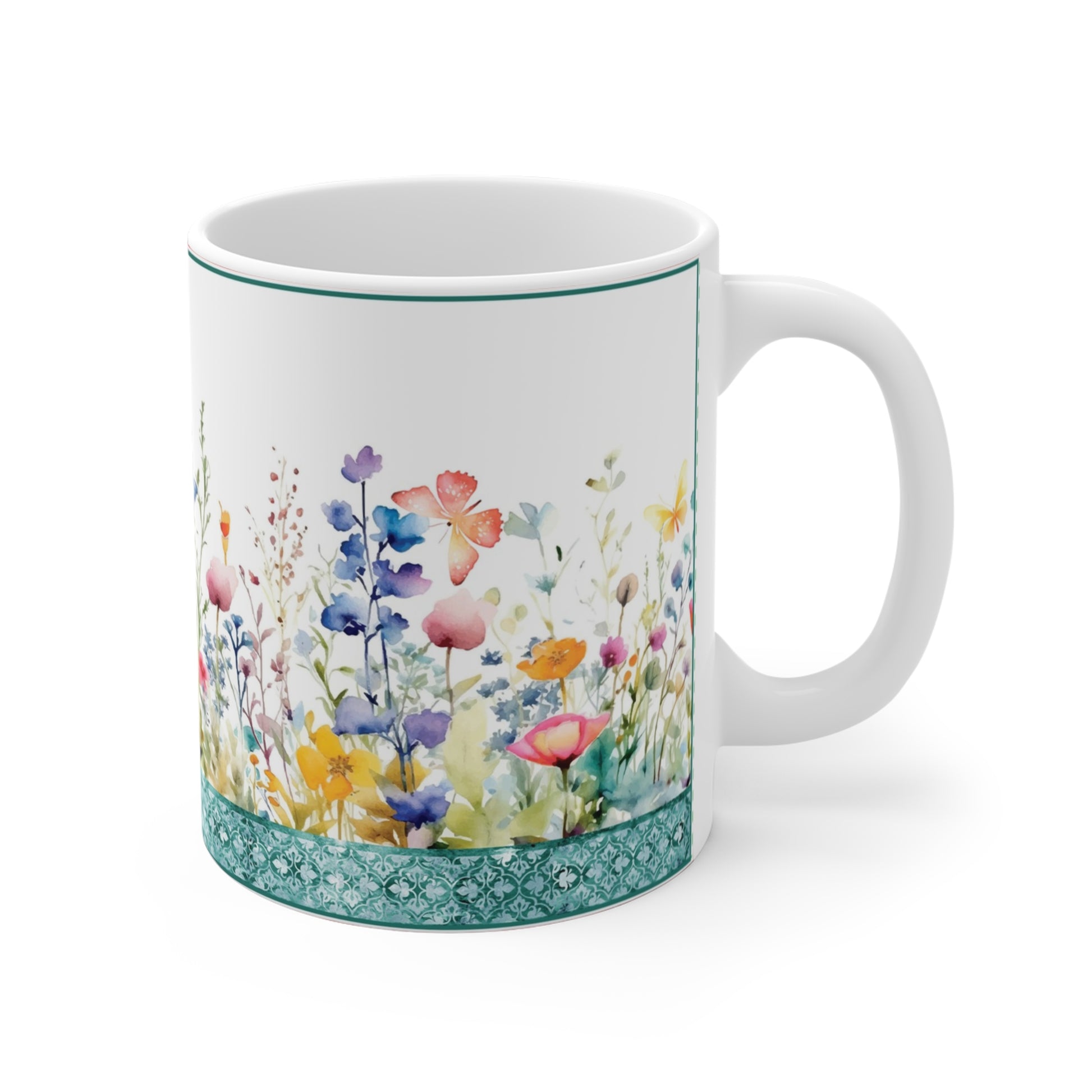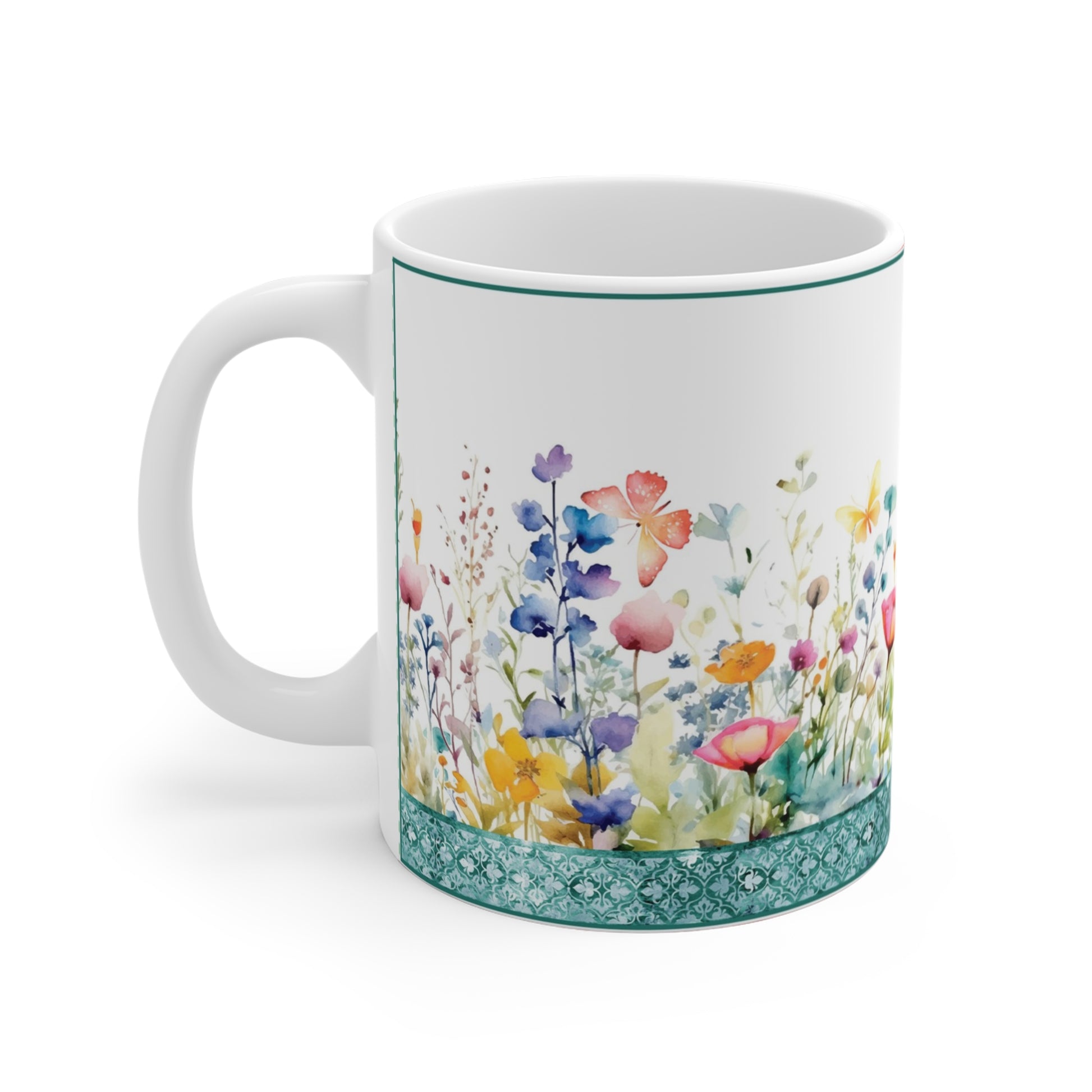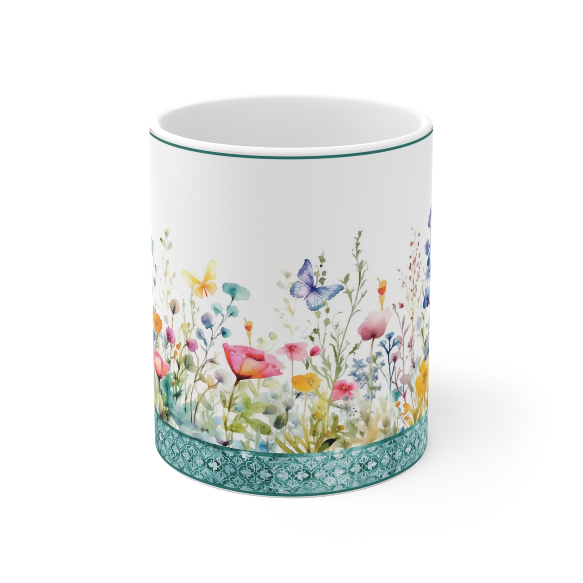 Ceramic Mug: White; Butterfly Fantasy [Flower Border]