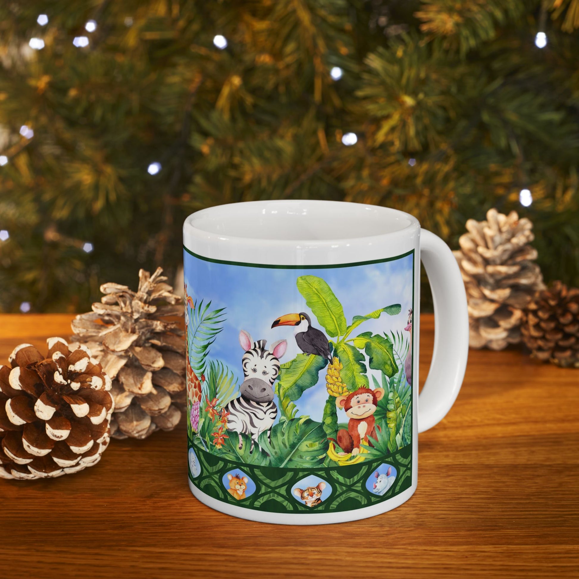 Ceramic Mug: White; "In The Jungle" [Border] - Original desigh from In the Beginning Fabrics.