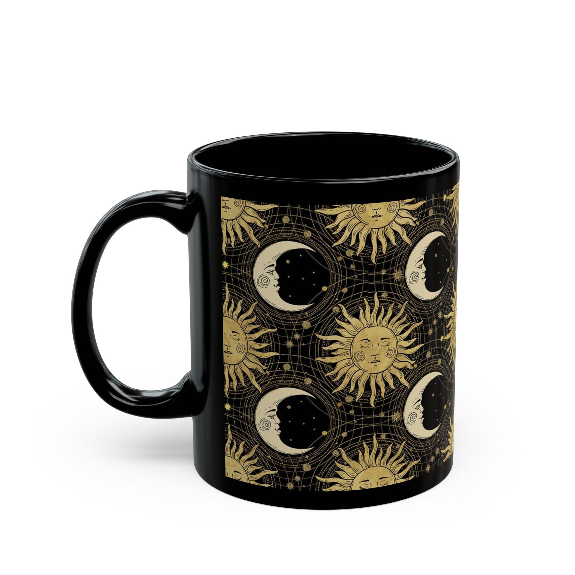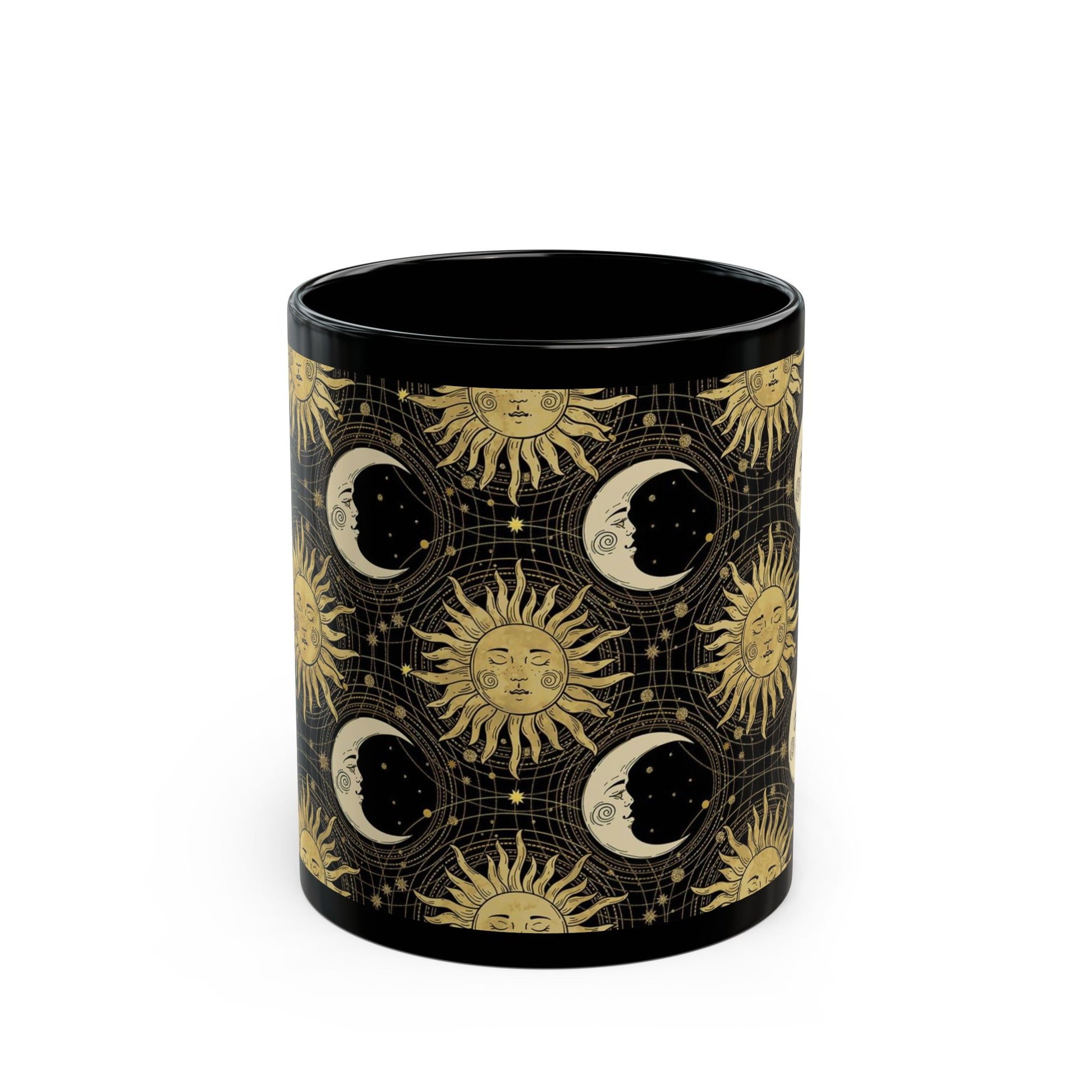 Ceramic Mug: Black; "The Sun, The Moon, And The Stars" [Sun and Moon-Gold] - From In the Beginning Fabrics.